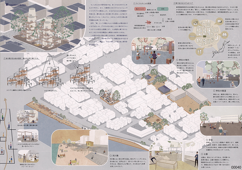 もし,人類が家を持たずに生きるとしたら?と仮定し,その世界を新狩猟採集時代と名付けた.そこでは住宅は身を隠すためだけの傘となり,街が人々の家となる.