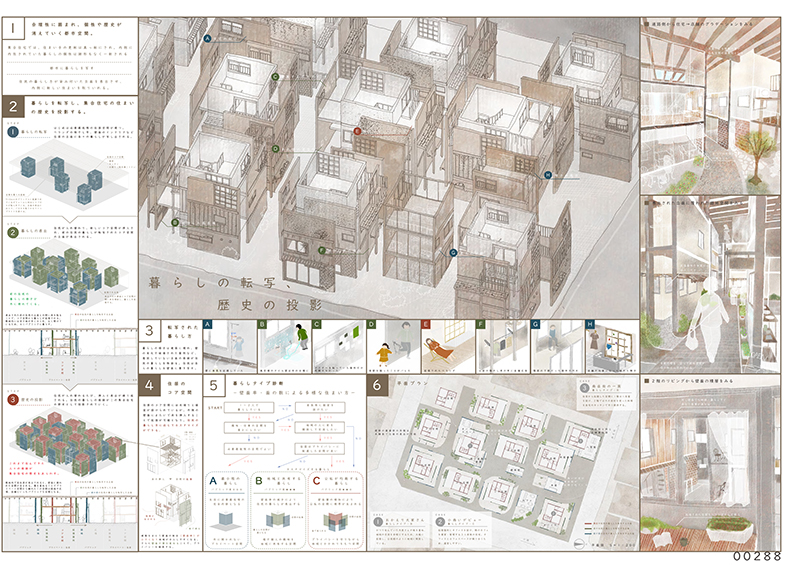 合理性に囲まれた現在の都市空間では,個性や歴史が消えていく.住戸に内包されていた住民の個性でさえも,住民の更新により,跡形もなく一新される.しかし,暮らしの様子とその痕跡は建築に転写され,住民の暮らしを物語っていた.転写された立面を表出させ,内側に新しい住戸を取り入れる更新により,前の住民の暮らしの様子が外にあらわれる.この更新は繰り返され,これまで住んできた人びとの痕跡が,この集合住宅の歴史となって都市に投影される.