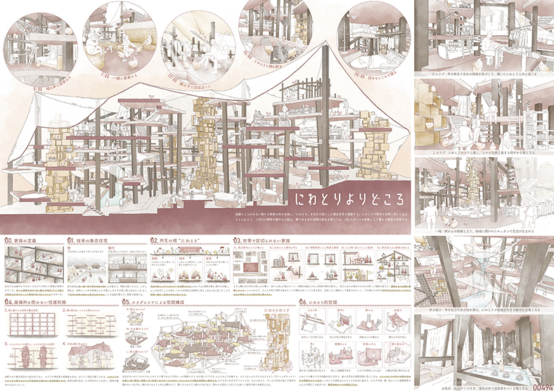 かつての集落は水,食,祈り等の共生の核に人が集まり,そこで愛情,場所,時間を共有することで家族が成り立っていた.今回の提案ではにわとりを共生の核として位置付ける.世帯という枠を取り払い,にわとりの習性を空間的に落とし込むことで100人が一つの家族として暮らす集落を形成する.