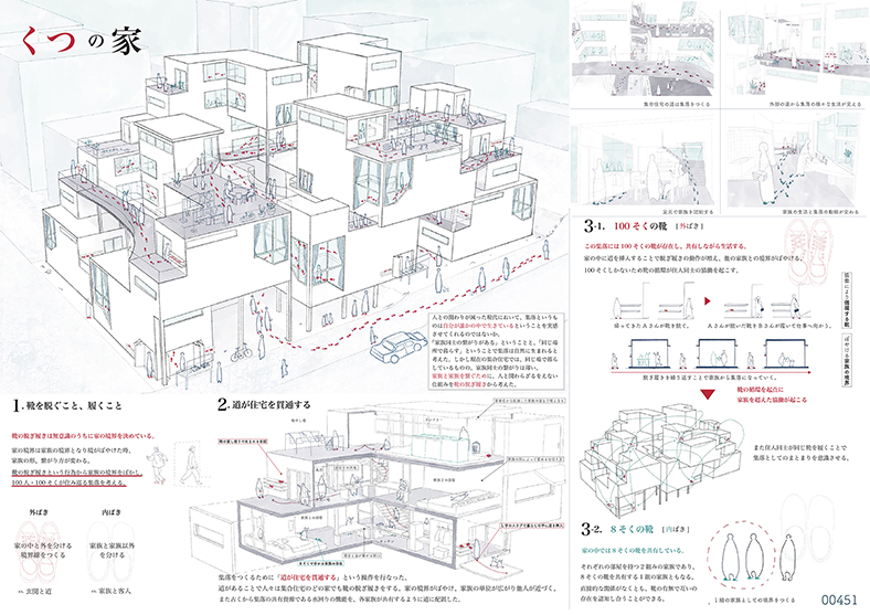 靴の脱ぎ履きは無意識のうちに家の境界を決めている.靴の脱ぎ履きという行為から家族の境界をぼかし,100人・100そくが住み,巡る集合住宅.靴が循環することで協働を起こし,新しい家族の形・集落を作る.