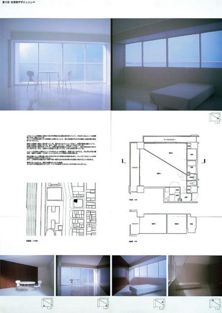 このユニットは西側と北側にそれぞれ特徴のある開口部を持っていて、それがこのユニットの空間性に大きく関わっている。ユニットを対角の壁で2つの部屋に分割することで、個々の部屋がそれぞれ西側と北側の開口部を持つようにした。部屋Aは西側に掃出し窓を持っている。窓の外にはバルコニーがあり、対面の建物は離れていて、午後には明るい日差しが入る。また、玄関・キッチン・水周りにつながっている。部屋Bは北側に腰窓を持っている。対面の建物は西側よりはずいぶん近く、朝には東の空のやわらかい光が入る。また、玄関からは部屋Aを通って入る。大きな収納を持っている。ユニットを対角に分割することで生まれた2つの部屋は、等価優秀賞 難波千帆でありながらも、それぞれが持つ開口部・接続する空間・プロポーションなどによって微妙に性質が異なる。斜めの壁によって開口部に向かう伸びやかさや多様な方向性が生まれ、コンパクトなユニットの中に面積以上の拡がりが感じられる。また、三角形状の部屋は広い場所や狭い場所を生み生活の様々な活動に対応することが出来る。等価でありながらも、適度な差異を持つ2つの部屋。そんな2つの部屋を設えることが、ここでの生活にふさわしいのではないかと思った。 (応募図書より)